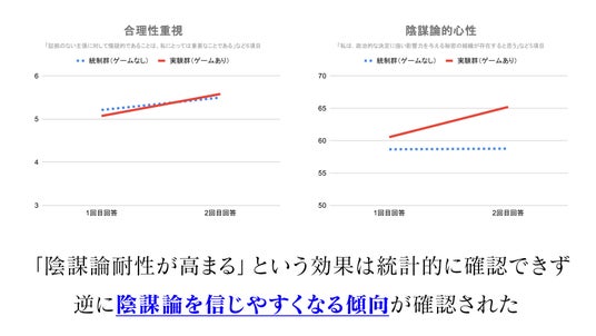 2025年6月、大薗准教授・榊原准教授らと共同で効果検証を行いました。大学生36名を対象に、ゲーム実施前後で陰謀論に対する態度や信念の変化を測定する調査を実施。単に繰り返し態度や信念に回答してもらう「統制群」と比較することで、ゲーム実施の効果を分析しました。