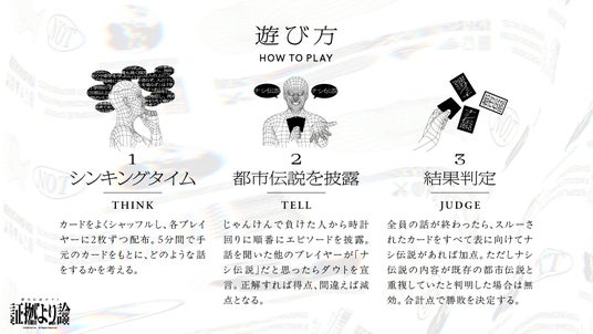 「都市伝説カード」と「ナシ伝説カード」がランダムに2枚ずつ配られたあと、5分間のシンキングタイムを設け、各自がエピソードの準備を行います。「ナシ伝説カード」にはお題にそった豆知識が記されており、プレイヤーはこれをヒントにしてありもしない都市伝説を創作します。良質な嘘ほど事実を巧みに織り交ぜているため、聞き手は惑わされやすくなります。