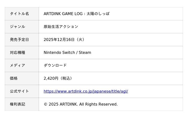 株式会社アートディンクは、Nintendo Switch(TM)、Steam(R)にて「ARTDINK GAME LOG:太陽のしっぽ」を2025年12月16日(火)に発売することを発表いたしました。