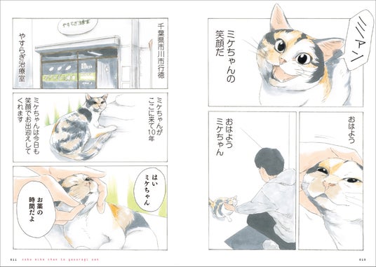 千葉県市川市の鍼灸マッサージ治療院「やすらぎ治療室」で暮らす看板猫・三毛猫のミケちゃん。生まれつき後ろ足が1本ない野良猫のミケちゃんは、嵐の夜をきっかけに院長の冨森さん(通称やすらぎさん)の店猫として暮らすようになりました。