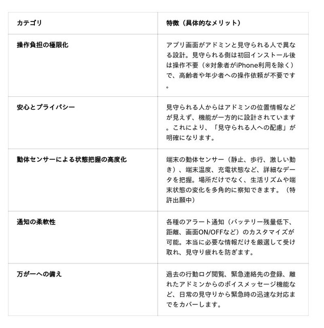 従来のスマート見守りサービスは、見守られる側にも頻繁なアプリ操作や設定変更を求めたり、常に位置情報が共有されることによる心理的抵抗感を生じさせたりする課題がありました。Liloggは、この「操作負担」と「監視感」が家族の負担を生む原因と捉え、「見守られる側は招待を受けてインストールするだけ。その後は基本的に操作を依頼しない」という設計思想を徹底しました。これにより、高齢者や年少者のいるご家庭でも、ストレスなく導入・継続利用が可能です。