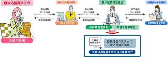従来、保険代理店業務に携わる不動産管理会社は、入居者情報等を保険会社の提供する代理店システムに一から入力する必要がありました。この度の連携では、「スマート申込」に入力された、氏名・生年月日などの入居者情報と、物件情報が自動で代理店システムに反映されるため、入力業務や確認業務等の負荷が軽減され、誤入力も防止でき、保険代理店業務の効率化が可能になります。さらに入居者は何度も入力する手間がなくなり、利便性の向上が図れます。
