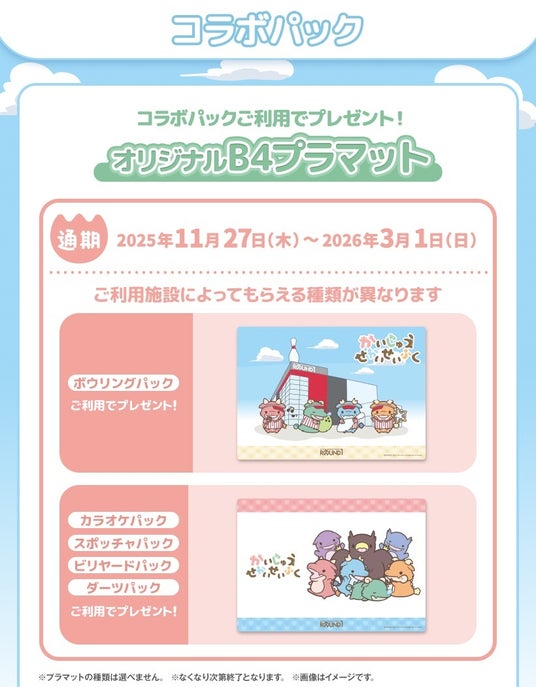 全国のボウリング96店舗、カラオケ91店舗、スポッチャ53店舗、ビリヤード46店舗、ダーツ74店舗でコラボパックを販売いたします。各店舗で販売するコラボパックで施設を利用していただいたお客様には、オリジナルB4プラマット(全2種)をプレゼントいたします。