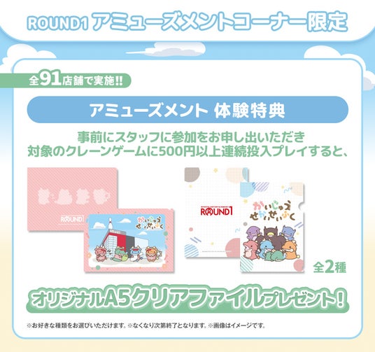 全国のアミューズメント91店舗にて、対象のクレーンゲームに500円投入すると、もれなくオリジナルA5クリアファイル(全2種)をプレゼントいたします。