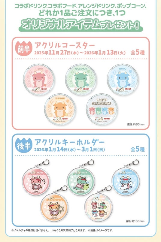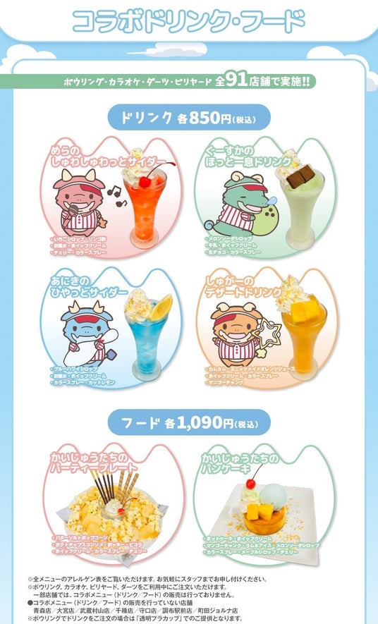 全国のボウリング、カラオケ、ダーツ、ビリヤード全91店舗でコラボドリンク・コラボフードを、スポッチャ全53店舗ではアレンジドリンクとコラボポップコーンを販売いたします。コラボメニューをご注文のお客様には、オリジナルアクリルコースター(全5種)またはオリジナルアクリルキーホルダー(全5種)をプレゼントいたします。