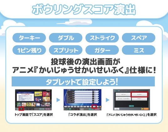 全国のボウリング96店舗にて、ボウリングスコア表示モニターでの表示演出をコラボ仕様に変更することができます。コラボパックのご利用と合わせて、ぜひお楽しみください。