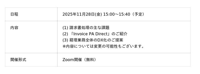 株式会社ニーズウェル(本社:東京都千代田区、代表取締役社長 松岡 元)は、2025年11月28日(金)15時より、無料オンラインセミナー「請求書のオンライン受取りで進化する経理業務DX ~「Invoice PA」、「Invoice PA Direct」が変える!請求書データ受取りから証憑入力までの自動化で請求書処理の業務負担を大幅削減~」を開催します。