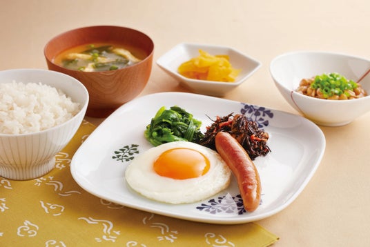 主食や副菜などバランス抜群で、ソーセージ・卵・納豆などタンパク質を含む食品を気軽にとれる嬉しい定食です。