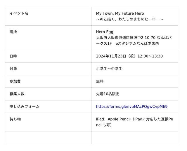 株式会社Meta Heroes(本社所在地:大阪府大阪市、代表取締役:松石和俊、以下「当社」)は、当社が運営するDX教育施設「Hero Egg(ヒーローエッグ)」(大阪・なんばパークス内)にて、元Apple米国本社副社長で、iPod miniの大ヒット仕掛け人として知られる前刀 禎明(さきとう よしあき)氏をお招きし、子どもの創造性を育む特別ワークショップ「My Town, My Future Hero ~AIと描く、わたしのまちのヒーロー~」を、2024年11月23日(祝)に無料開催します。