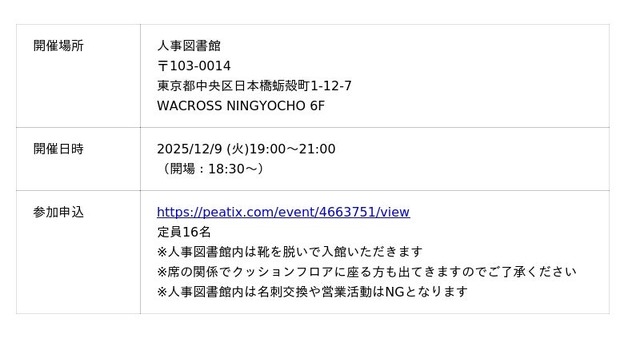 2024年4月1日に東京人形町にオープンした、人事関連職が集まるコワーキング×コミュニティ。2500冊以上の人事に関する書籍と700名以上の会員を有しており「仲間と学びで、未来を拓く」をタグラインに運営しています。