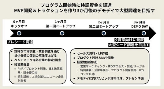 調達のタイミングや規模は各チームの判断に委ねつつ、ネットワーク構築や次ラウンドに向けた関係づくりを支援します。さらに、起業を志す仲間と出会い、オンライン/オフライン双方で継続的なメンタリングや交流を得られるため、将来の創業メンバー候補に出会える環境も整えています。当社のグローバルネットワークを活用し、海外VCや現地パートナー企業の紹介、海外展開を見据えたチームビルディング支援など、早期のグローバル進出を視野に入れた伴走支援も行っています。