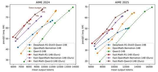 下図では、縦軸が精度、横軸が計算効率(トークン消費量)を示しています。グラフ上方ほど精度が高く、左方ほど効率が高いことを意味します。実線で示されたFast-Mathモデルファミリーは、破線の既存モデルと比較して、効率性の面で大幅な改善を示しています。