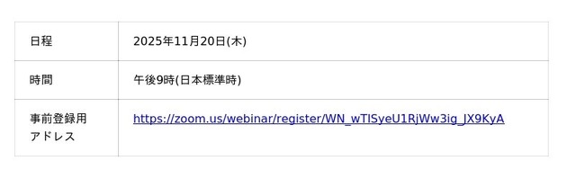 日本語版の決算説明会はWEB会議システム(Zoom)にて実施いたします。以下のご案内をご確認の上、事前登録をお願いいたします。
