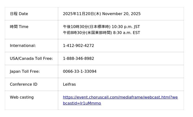 2025年11月20日(木)午後9時(日本標準時)から日本語による決算説明会を、午後10時30分(日本標準時)から英語による決算説明会を開催します。