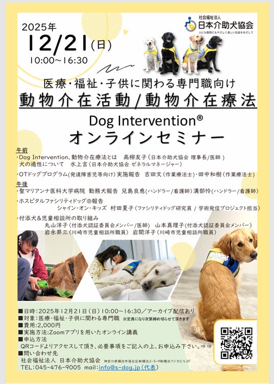 昨今、動物介在療法・動物介在活動への関心が高まり、医療従事者等からの問い合わせが増える中、「適性のある犬の介入が必須かつ重要であること」「犬はきっかけにすぎず、そこに介入する医療従事者等の見識の重要性」を伝える機会としてセミナーを実施する。