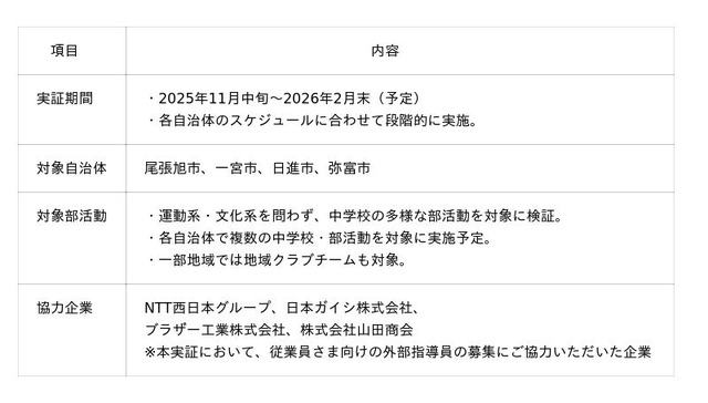 本実証では、2025年2~3月に尾張旭市で行った実証実験の成果をもとに、尾張旭市・一宮市・日進市・弥富市の4つの自治体へ対象を拡大。また、東邦ガスの呼びかけにより、NTT西日本グループ、日本ガイシ株式会社、ブラザー工業株式会社、株式会社山田商会の各社にもご協力いただき、各社の従業員を対象に、部活動の外部指導員として参加いただける方の募集活動も行いました。