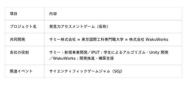 本プロジェクトでは、サミーの新規事業開発における構想力、IPUT の教育実践力、WakuWorks の開発推進・実装支援の知見を掛け合わせ、協働体制を構築。
