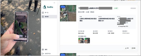 「SuiDo-DX」は、漏水調査の現場で撮影した写真や位置情報を、従来の報告内容にあわせてスマートフォンから簡単に送信できるアプリです。これまで調査会社が現場で調査を終えた後、30分以上かけて報告書を作成し、提出・移動までを行っていた業務が、わずか2分で完了するようになりました。
