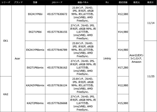 日本エイサー株式会社(本社:東京都新宿区、代表取締役社長:ボブ・セン)は、Acerブランドより、フルHD・リフレッシュレート144HzのIPSパネルを搭載した23.8モニター「EK241YP6bi」「EK241YP6bmix」「KA242YP6bmix」、および27インチモニター「EK271P6bi」「EK271P6bmix」「KA272P6bmix」の計6機種を、Amazon、Acer公式オンラインストア、Acerダイレクト(楽天市場・Yahoo!ショッピング)にて本日より順次発売いたします。「EK241YP6bmix」「KA242YP6bmix」「EK271P6bmix」「KA272P6bmix」の発売は11月25日を予定しております。