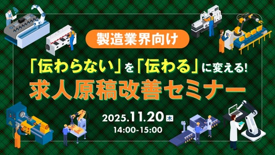 「働く」に関する社会課題をビジネスで解決するキャムコムグループの株式会社天職市場(以下天職市場、本社:東京都新宿区、代表取締役:春名敬太 )は、2025年11月20日(木) 14:00よりオンラインセミナー「製造業界向け 『伝わらない』を『伝わる』に変える!求人原稿改善セミナー」を開催いたします。