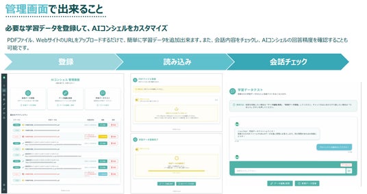 本機能により、顧客は「データ更新管理画面」から、AIに学習させたいPDFファイルやWEBサイトのURLを直接アップロード・指定するだけで、AIの回答内容を更新できるようになります 。