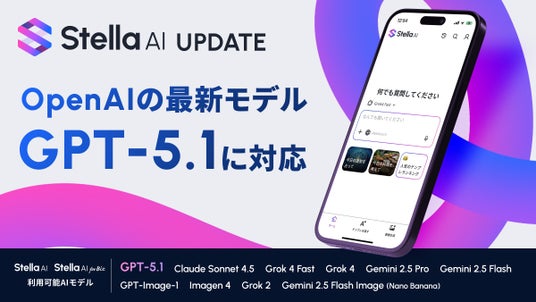 生成AIサービス開発を手掛ける株式会社SUPERNOVA(本社:東京都港区 代表取締役社長 木本 東賢 以下、当社)は、当社の生成AIサービス「Stella AI」および「Stella AI for Biz」で利用可能なAIモデルに、OpenAI社の最新AIモデル「GPT-5.1」を2025年11月14日(金)より追加します。