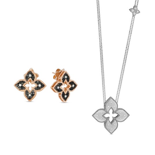 ヴェネチアの宮殿に由来する古典柄のモチーフから着想された「ヴェネチアン プリンセス」は、神話的で魅惑的なコレクション。 ヴェネチアの宮殿の装飾を再解釈したプリンセスファミリー全体のロマンチックな雰囲気を際立たせています。ブラックとホワイトのダイヤモンドの戯れは、ヴェネチアの運河の暗い水面に反射する街灯のほのかな光を想起させ、街の神秘的な雰囲気をさらに際立たせる魅力的な効果を生み出しています。