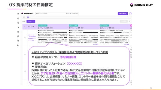 顧客が語る課題と自社が提案できる商材及び提案内容を自動マッチングして生成し、営業に提示