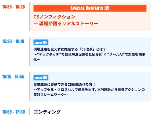 初めての開催となる「カスタマーサポートカンファレンス2025」では、AIと有人対応の役割分担や事業成長に寄与するカスタマーサポートを考えるセッションや、有名サービスのカスタマーサポートの裏側を語り合うトークセッションなどを予定しています。全8つのセッションでは、カスタマーサポートの現場で活躍する担当者からのリアルな声から、カスタマーサポートにまつわるサービスを提供するプロフェッショナルたちによる、最前線の知見やノウハウをたっぷりとお届けします。