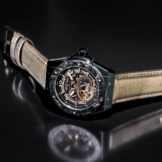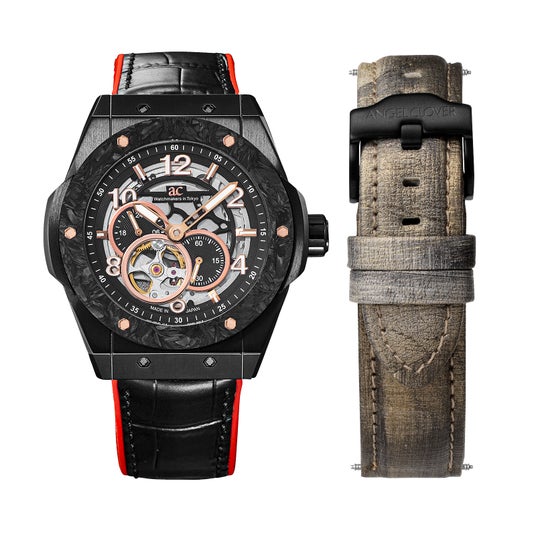 これに加えて、姫路の職人による手塗りアート染め アストラットレザーの、カスタムゴールドストラップが付属します。