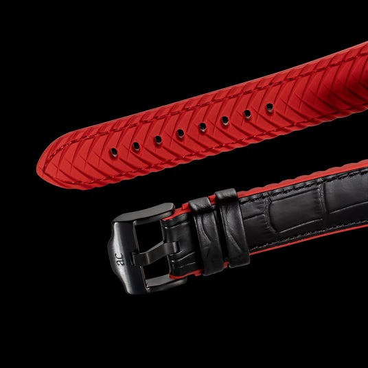 デフォルトのレザーのベルトの裏面はシリコンを圧着させたハイブリッドベルト。軽量かつ撥水、耐久性に優れ、装着感もすこぶる快適。また汗や水によるベルトの変形も防ぐことができるメリットもあり。