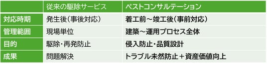 単なる害虫駆除にとどまらない、竣工後のメンテナンス軽減、設計・工事の付加価値向上、環境配慮型施設づくりの一助といった効果を同時に実現することを目指しています。