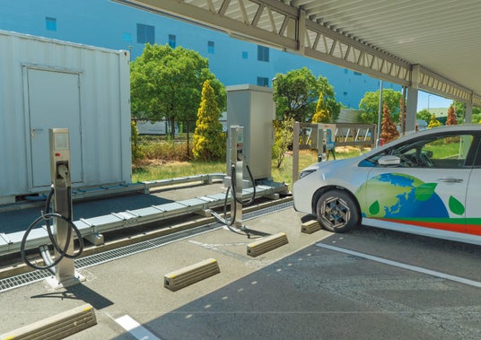 再エネ100%で EV充電太陽光発電と蓄電池を組み合わせ、EV充電器を備えたシステム。パネル設置スペースがなくても駐車場で再エネ導入が可能。EV急速充電に対応し、停電時は防災拠点として非常用電源を供給します。