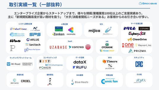 特に、「大手企業~スタートアップ企業の決裁者開拓」に強みを持っており、これまで様々な業種業界、規模感のお客様とお取引をさせていただいております。