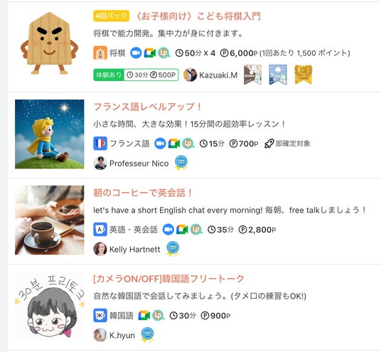 カフェトークのオンラインレッスン一覧:https://cafetalk.com/lessons/?lang=ja
