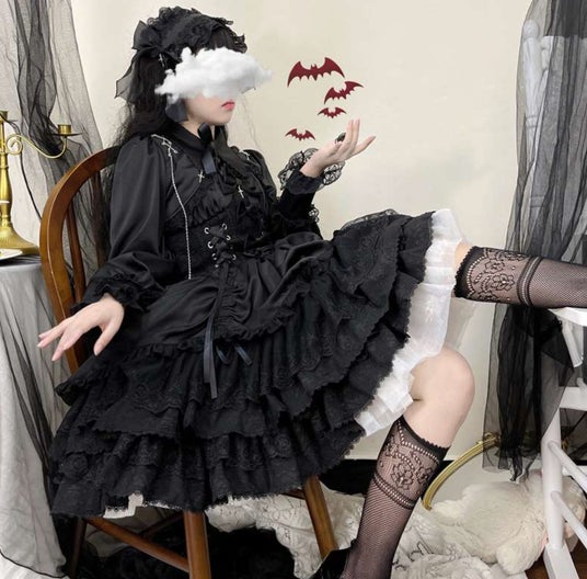 ふんわりとしたパフスリーブと重ねレースのスカートが特徴的な優美なドレスワンピース。胸元の編み上げデザインと、リボンの装飾が可愛らしさを演出。ゴシック調の十字架刺繍がアクセントになっています。