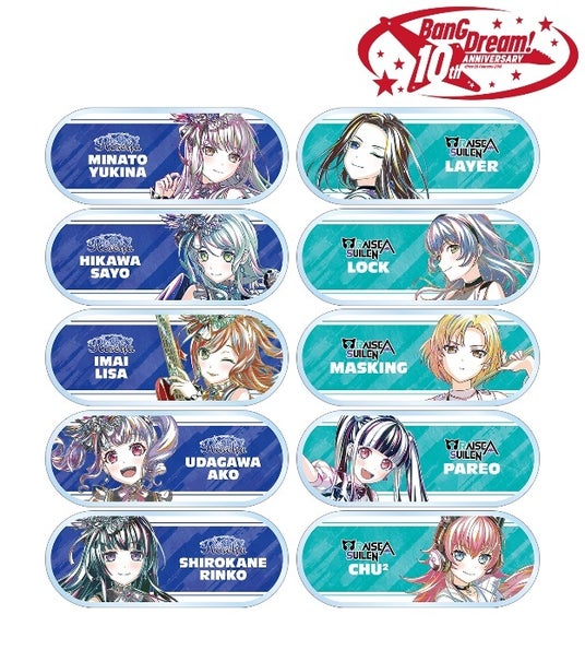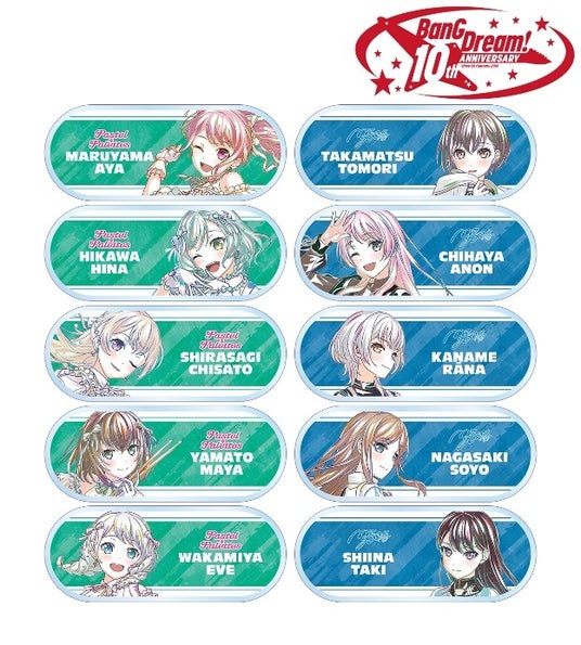 丸山 彩、氷川 日菜、白鷺 千聖、大和 麻弥、若宮 イヴ、高松 燈、千早 愛音、要 楽奈、長崎 そよ、椎名 立希のイラストを新たなタッチで魅力的に表現し、アクリルネームプレートに仕上げました。