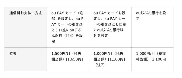 (2) 通信料お支払い特典:通信料のお支払いにau PAY カード/auじぶん銀行をご利用で毎月最大1,500円キャッシュバック