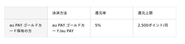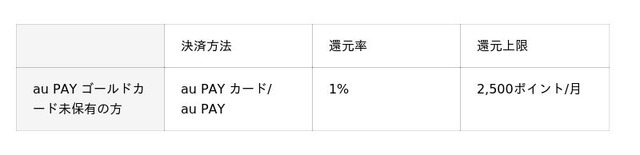 ※プラン特典とは別で、通常のau PAY カード決済によるベースポイントもたまります。au PAY カードは100円ごとに1Pの還元(1%)、au PAYは200円ごとに1P(0.5%)の還元です。ベースポイントには上限がありません。