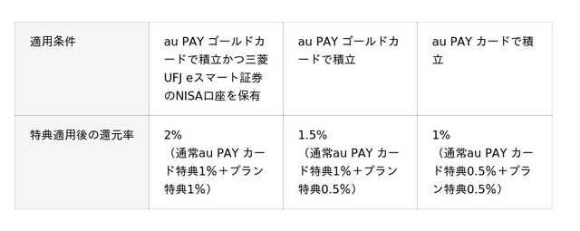 さらに、クレカ積立特典として、三菱UFJ eスマート証券での投資信託の積立購入資金の決済方法にau PAY カードを利用した場合、毎月積立で買付された投資信託の約定金額に応じたポイント還元率を上乗せします。
