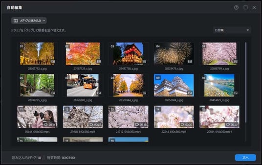 自動編集で作成された動画の中から、好きなものを選んでタイムラインに追加し、後から細かい調整を行うことも可能です。