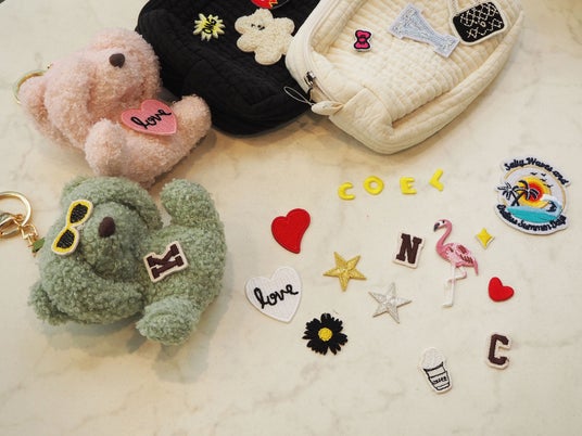 人気のぬいぐるみチャームやポーチ、トートバッグなどのアイテムにワッペンワークが楽しめます。
