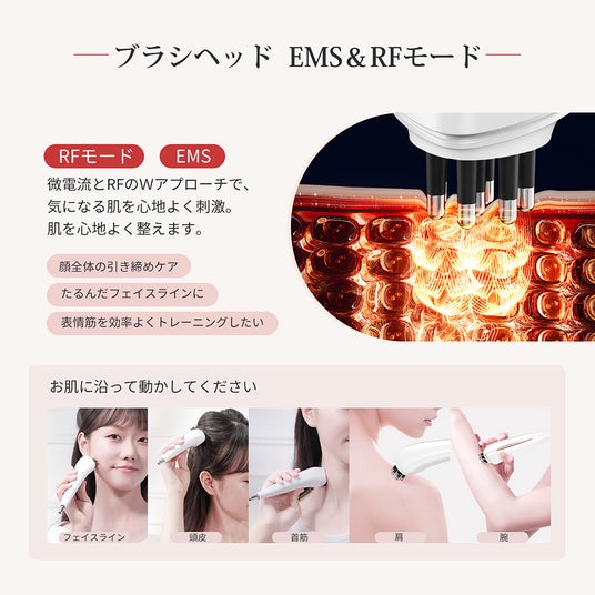 東洋の伝統的な美容法「ツボ押し」に着想を得たポイント型のヘッドで、顔や首、肩などのコリをピンポイントでほぐし、すっきりとした印象へ導きます。さらにRF(ラジオ波による温熱ケア)で肌の奥までじんわりと温め、EMS(微弱電流)で表情筋を効率的に刺激することで、フェイスラインの引き締めやハリ感アップを目指します。