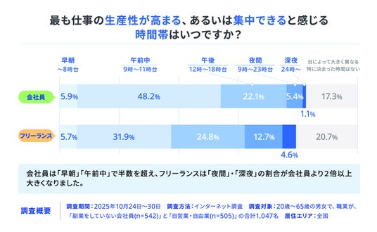 - 仕事に集中できる時間帯について、会社員は会社の始業時間もあることから早朝と午前中が半数を超え、時間の自由度が高いフリーランスは午後から深夜の回答が多い傾向に
