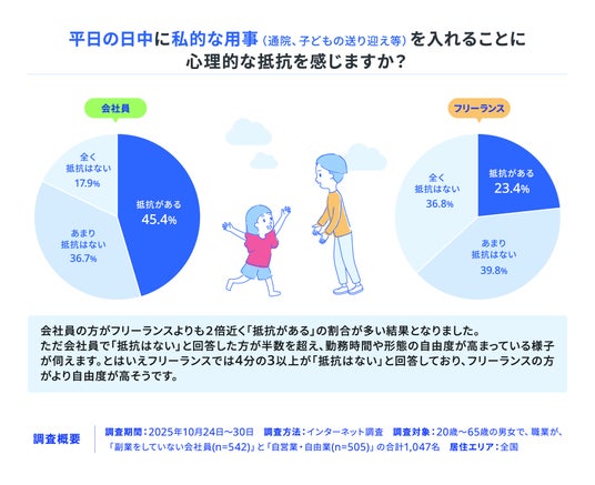 平日の日中に私的な用事を入れることに心理的な抵抗を感じるかについて聞いたところ、「抵抗がある」の回答は会社員が45.4%、フリーランスが23.3%となり、20%近い差が出ることがわかりました。