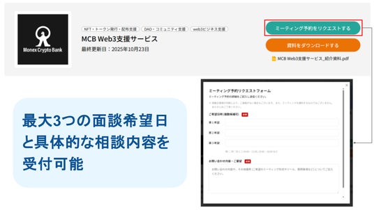 そこで、MCB FinTechカタログでは、より良質なリード創出と効率的な商談設定を実現するため、掲載企業が、ユーザーからの資料請求に加えて面談希望日(最大3つ)と具体的な相談内容を受け付けられる新機能の開発に至りました。これにより、掲載企業はカタログ掲載を通じて、検討度の高い見込リードとの商談をスムーズに獲得できるようになりました。
