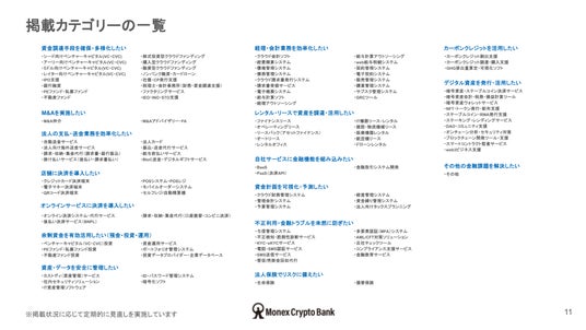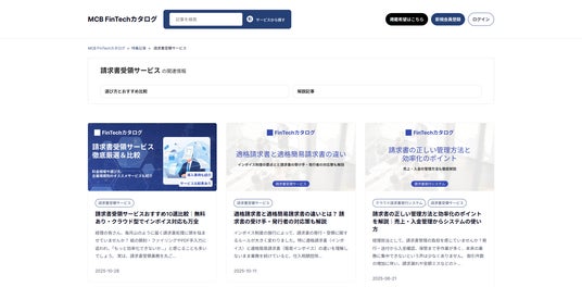 マネックスクリプトバンク株式会社(本社:東京都港区、代表取締役社長:万代惇史、以下「マネックスクリプトバンク」)は、金融領域の法人向けサービスを課題別に比較・検討できる資料請求サイト「MCB FinTechカタログ」において、累計掲載サービス数が100を突破したことをお知らせします。