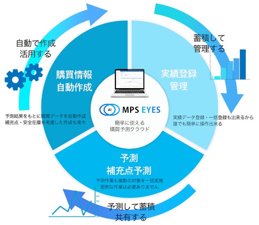 「MPS EYES」は、調達計画に必要なデータの管理・蓄積から、需要予測の実行、調達実務に必要なデータの自動作成までワンストップで完結可能なサービスです。新バージョン「MPS EYES」V3.0では、さらに予測機能の拡充から、予測の精度と業務効率を向上させる機能まで大幅に拡大しております。