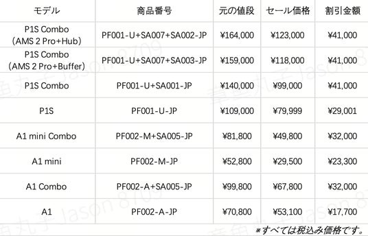 今回のタイムセールでは、P1S単体、A1 Combo、A1 mini Comboを目玉商品としております。その他の対象商品は、ぜひタイムセールページにて詳細をご確認ください。