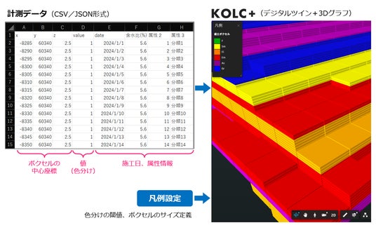 KOLC+「3Dグラフ」でボクセル対応するには、CSVまたはJSON形式で、ボクセルの「中心座標」と「属性情報」を用意するだけです。色分けの凡例設定やボクセルのサイズ定義は、KOLC+側のクラウド画面で設定可能です。色分けは現場ニーズに合わせて簡単にカスタマイズできます。